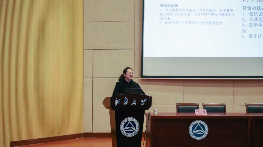 分管本硕教学工作的副院长王雷教授主持会议,并传达了江南大学研究生院关于导师培训的文件精神,指出研究生导师培训常态化是推进高素质导师队伍建设的重要举措,希望研究生导师积极参与。随后邀请了国家二级心理咨询师、江苏省辅导员年度人物、生工学院副教授胡博做了《研究生心理问题的识别与应对》讲座。胡博结合案例介绍了研究生常见心理问题的表现和有效识别方法,号召导师坚持关爱学生,在关注学生的学习和科研之外,也要多关注学生的思想动态和心理健康,并且针对性地讲解了研究生心理危机事件中导师应对处置办法。