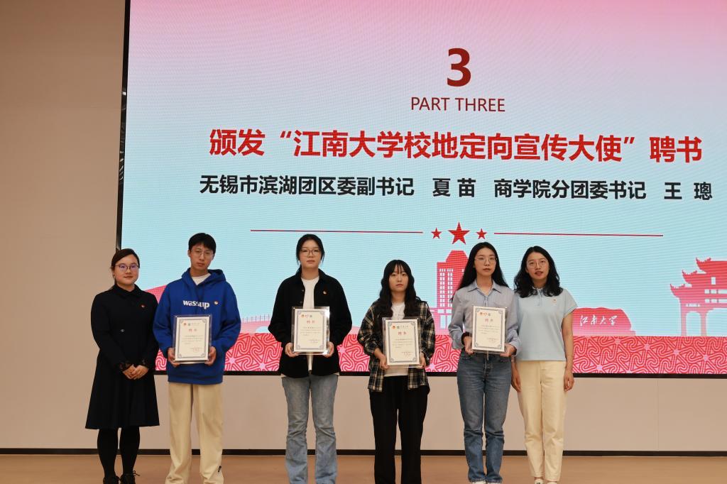 接着,夏苗和王璁为王伟康、朱佳慧、吕姣姣、李心萍等四位志愿者颁发了江南大学“校地定向”宣传大使聘书。校地定向宣传大使不仅是学校优秀毕业生代表,更是传递校园文化、展示学校风采的重要使者,他们以专业的素养和独特的视角为推广江南大学而不懈努力,相信在他们的努力下,我校的校地合作将会更加紧密,乡村振兴计划也会取得更加显著的成效。