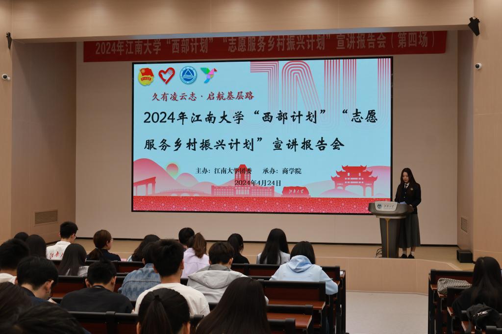 为进一步引导学生去基层就业,在祖国最需要的地方建功立业,4月24日下午,2024年江南大学“西部计划”“志愿服务乡村振兴计划”宣讲报告会(第四场)在江南大学第一教学楼1C109举办,活动由商学院承办。无锡市滨湖团区委副书记夏苗、商学院分团委书记王璁、乡村振兴计划志愿者王伟康、朱佳慧、吕姣姣、李心萍出席活动,各学院100多名2024年应届毕业生及在读研究生参加活动。宣讲报告会由商学院23硕第二党支部书记袁梦迪主持。
