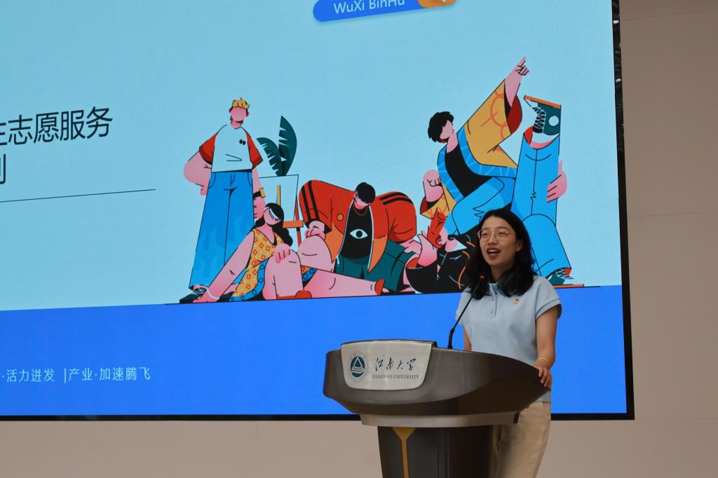 随后,夏苗作滨湖区“乡村振兴计划”招募政策宣讲。夏苗从地区、岗位与政策三方面展开,带领同学们全方位领略了滨湖的群贤毕集、人杰地灵。自启动江苏大学生志愿服务乡村振兴计划以来,滨湖团区委在团省委、团市委的坚强领导下,积极引导大学生助力乡村人才振兴,夯实乡村振兴青年人才库建设要求,展现当代大学生投身基层、建功乡村的志愿服务精神。在宣讲尾声,夏苗代表滨湖区向江南学子发出了诚挚的邀约,希望江大青年能志愿始于心,奉献在于行,与滨湖区实现最真诚的双向奔赴。