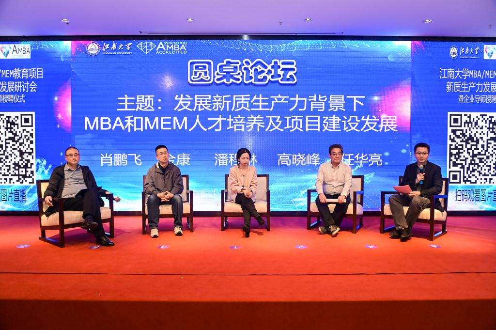圆桌论坛环节,由江南大学商学院副教授、MBA项目学术主任任华亮老师担任主持,德地氏流程系统设备(无锡)公司CFO肖鹏飞,上海形家广告设计有限公司董事长金康,某国际证券董事潘程琳,无锡王道科技有限公司董事长、CEO高晓峰等四位企业导师担任分享嘉宾,大家共同了探讨新质生产力背景下MBA和MEM人才培养及项目建设发展,大家提出了对新质生产力的理解以及与教育项目培养建设融合发展的思考分享。