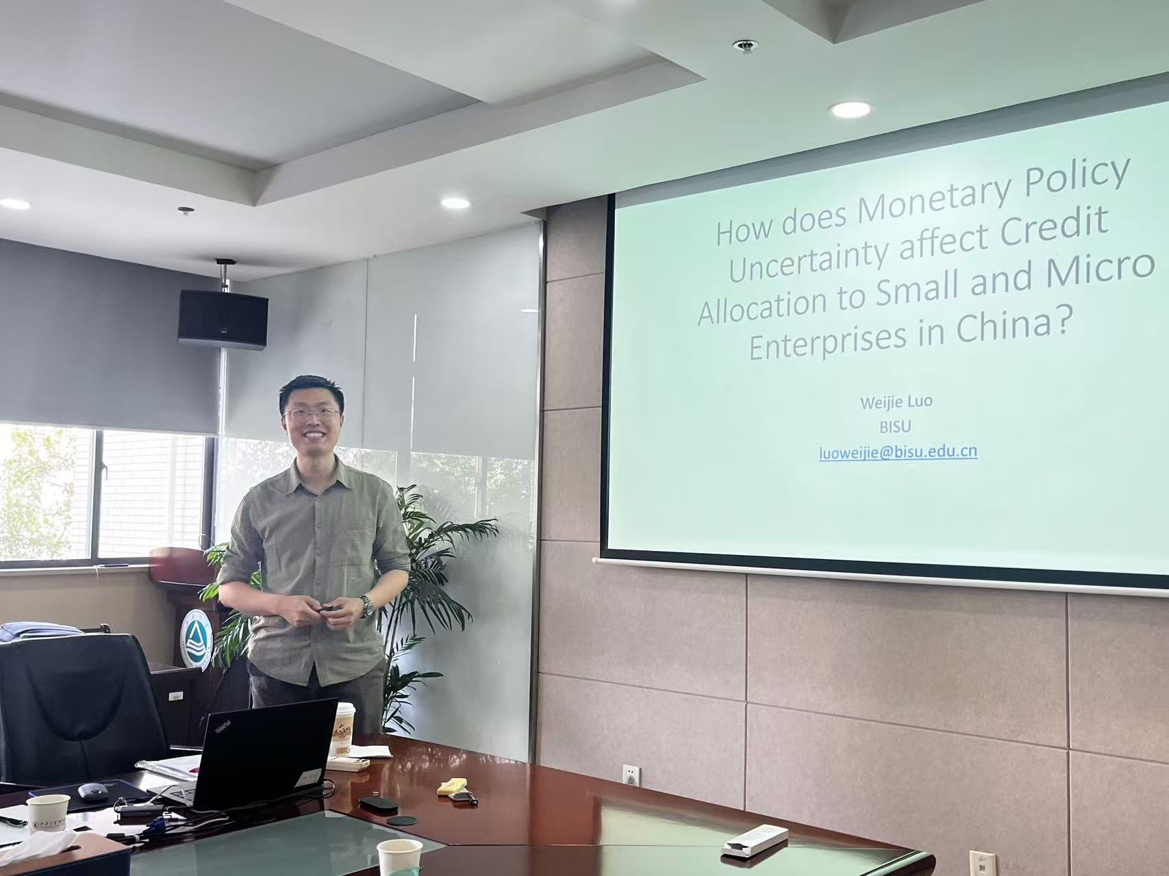 近日,“青年博士学术工作坊”第十三期在商学院304报告厅举行。英国约克大学经济学博士,英国剑桥大学访问学者,北京第二外国语学院副教授、硕士生导师罗伟杰老师应邀作题为“货币政策不确定性如何影响中国小微企业的信贷资源配置”的学术讲座。本次讲座由商学院教师张雪梅博士主持,会计系和金融系师生共15人参加。