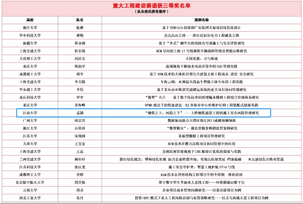 10月26日至27日,第三届中国研究生工程管理案例大赛全国总决赛在北京圆满落幕。本次大赛由教育部学位管理与研究生教育司、全国工程管理专业学位研究生教育指导委员会联合指导,中国学位与研究生教育学会、中国科协青少年科技中心共同主办。经过激烈的角逐,江南大学江南轨通智行队(指导老师:浦徐进、周亦宁;团队成员:何知、张国腾、孟颖、安楠、范进龙)凭借案例《“地铁之上,风险之下”——上跨地铁通道工程的施工安全风险管理研究》荣获重大工程建设赛道全国三等奖,展现了江南学子在工程管理领域的优秀才华和创新能力。