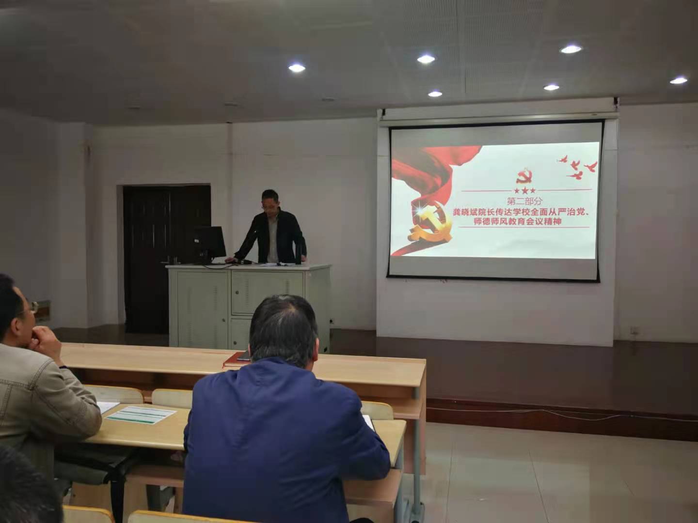 随后,龚晓斌院长传达学校全面从严治党工作会和师德师风警示教育会精神。他分别传达了校领导朱庆葆、陈卫、刘淼同志在学校2021年全面从严治党暨巡视整改工作推进会上的讲话精神,并带领全体教职工重温并强化学习了《新时代高校教师职业行为十项准则》,通报了学校近年来的师德问题典型案例。他指出,2021年是中国共产党成立100周年,是开启全面建设社会主义现代化国家新征程、向第二个百年奋斗目标进军的启航之年,也是学校“十四五”发展的开局之年,要把全面从严治党、师德师风建设和坚持立德树人这一根本任务融合起来,树立正确的价值导向,建设一支政治素质过硬、业务能力精湛、育人水平高超的高素质教师队伍。他要求领导班子成员要带头履行政治责任,对分管的部门加强监督指导,各部门负责人也要把责任扛在肩上,和领导班子齐心协力、共同研究,抓好抓实。