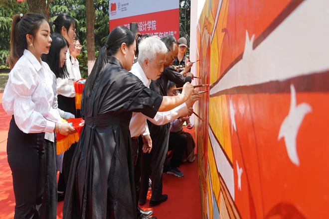 5月21日中午,“永远跟党走——师生同绘百年红墙”揭幕仪式在设计学院“百年红墙”广场举行,校党委常委、组织部部长张影陆,校党委常委、党委办公室主任、统战部部长朱飞,无锡博物院党总支书记肖炜,设计学院党委书记邱建平,设计学院院长魏洁,校党委教师工作部张海峰,设计学院全体党委委员、党支部书记、学生党员代表、学生积极分子代表、学院老中青三代党员教师代表等共100人出席。活动由院党委副书记王晖主持。