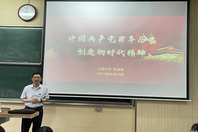 6月10日上午,江南大学副校长张凌浩走进设计学院课堂,以“中国共产党百年历史创造的时代精神”为题,为设计学院2020级产品设计专业讲授思想政治理论课,90余名学生参加学习。