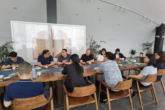 参观结束后,一行人同无锡博物院党总支书记肖炜、副院长蔡卫东等进行了充分交流座谈,希望借助江南大学设计学院党委和无锡博物院党总支的共建平台,在文物研究与文创设计开发、展览展陈等方面开展更为深入的研究和实践合作。