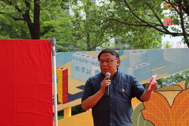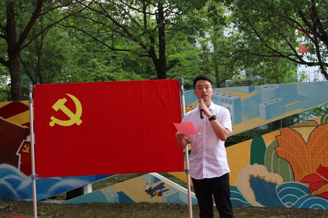 仪式最后,邱建平总结发言。他首先代表学院党委对新党员表示欢迎和祝贺。随后对新党员提出希望:一要坚定“设计力量”,通过重温百年红墙的创作历程,他指出不管是墙绘内容还是绘画元素,都是对“江南设计人”设计力量的肯定。二要肩负“设计担当”,结合七一建党一百周年庆祝大会中的精彩瞬间,诠释领诵者“请党放心,强国有我”时代口号内涵,提出对学院青年的殷切希望。三要立志“设计强国”,通过回顾张福昌、林家阳、王沂蓬等知名校友的励志故事,启迪学子志存高远,为设计改变未来贡献自己的力量。