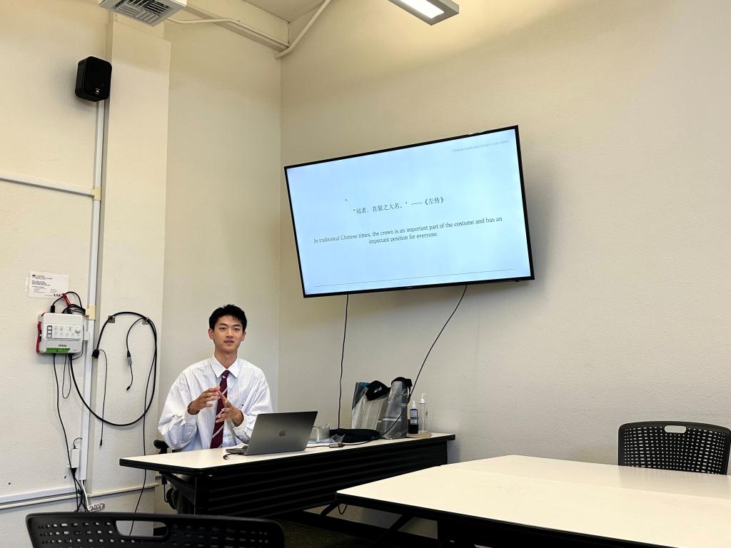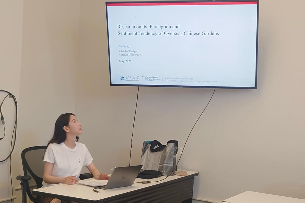 活动伊始,设计学院胡绮文、高祥、张译月和杨帆四位研究生分别介绍了各自的研究课题。胡绮文同学重点介绍了她对明代官迹图服饰的研究,高祥同学则分享了他对中国传统女性阶级冠饰的研究成果,张译月和杨帆则分别从史料分析与跨文化传播、中式景观园林的特点等方面阐述了她们的研究项目。