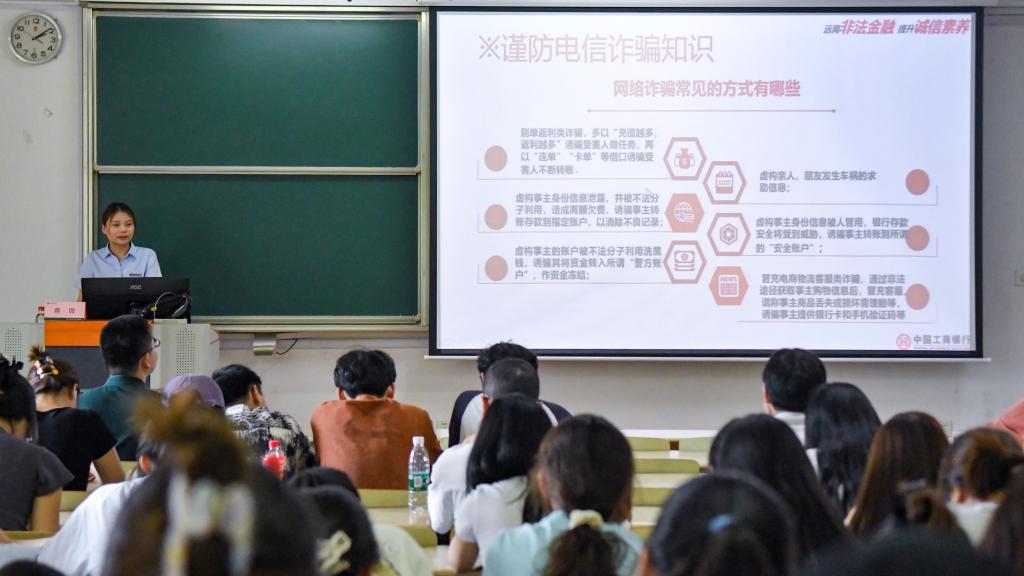 5月21日下午,生物工程学院在第二教学楼举办金融法制进校园宣讲活动,工商银行江南大学支行行长蔡微受邀担任主讲嘉宾,学院研究生辅导员张同舟和150余名学生代表共同参加活动。本次讲座紧紧围绕“远离非法金融,提升诚信素养”这一主线。蔡微从“识破陷阱”“筑牢防线”“守护信用”三个板块切入,通过真实案例、数据对比和法律法规解读,层层递进揭示非法金融活动的危害与防范要点。“刷单返利、虚假购物、冒充客服退款……这些看似简单的骗术为何屡屡得逞?”蔡微通过高校学生受骗案例,剖析了诈骗分子利用大学生社会经验不足、追求兼职收益等心理设计的陷阱。蔡微还专门介绍了征信的相关知识,她结合《征信业管理条例》,阐释了逾期还款、过度借贷对个人信用记录的影响,并纠正了“花钱修复征信”等常见误区,引导同学们要珍惜个人信誉,践行契约精神,合理合法开展各类金融活动。
