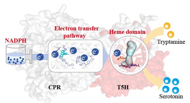 该研究团队以催化血清素合成的关键酶色胺-5-羟化酶(T5H,一种P450酶)和P450还原酶(CPR)为模型系统,开发了一种系统进化工程方法来提高双组分P450催化系统中的电子转移通量。基于定向进化和理性设计,首先通过重新设计CPR的电子转移途径来提高电子转移速率;然后,通过进化T5H的血红素结构域来提高电子接收速率;最后,通过微调NADPH合成来扩大电子供应。基于以上策略,最优突变体中T5H的催化活性(Kcat/KM)是野生型的36.62倍,工程菌株大肠杆菌S11可在7.5升生物反应器中产生15.42 g/L血清素。该结果为提高复杂P450催化系统中的电子转移通量和实现高效化学生物合成提供了新的策略。
