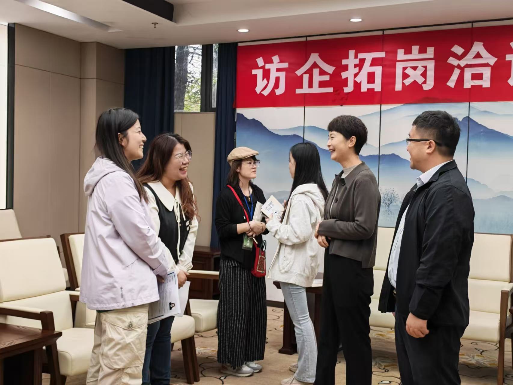 招聘会当天,外国语学院党委书记李荣华,党委副书记、副院长季王飞,班主任许兰娟、李建及辅导员朱家烨深入会场,化身“求职推荐官”,重点走访苏美达、江苏国泰等25家企业,详细介绍学院专业设置、人才培养特色及2026届毕业生情况,并将55份学生简历亲自递交给相关用人单位。此外,学院还精心准备了包含生源信息的“能量包”,助力企业更全面了解外院学子。