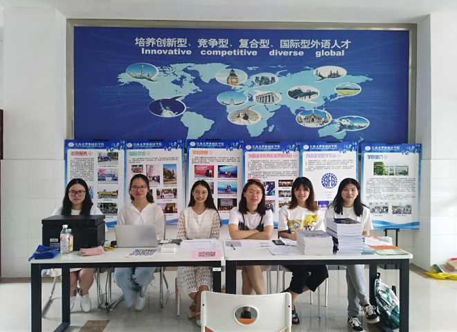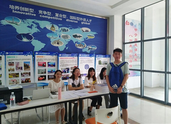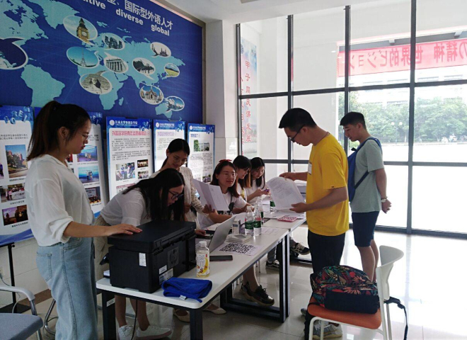 2019年9月5日7点,久雨初霁的早晨洋溢着喜迎新同学的氛围。外国语学院大楼一楼早已布置一新,刘伯贤副书记、朱义华副院长和分团委书记杨艳老师与外院研会的同学们早已在此等候,准备迎接2019级研究新生的到来。