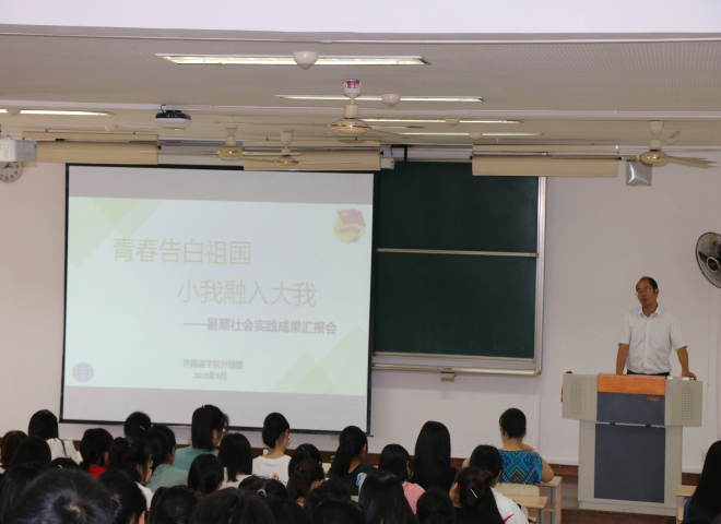 2019年9月18日下午三点,江南大学外国语学院“青春告白祖国,小我融入大我”暑期社会实践成果汇报会在第二教学楼2D108室举行。外国语学院党委副书记、副院长刘伯贤,学院分团委书记杨艳,三支暑期实践团队的学生代表以及2019级全体学生参加会议。