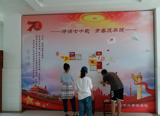 青春献礼庆华诞,砥砺奋进正当时。在中华人民共和国成立七十周年之际,外国语学院师生在国庆节来临之际通过系列活动以青春告白祖国。心中有大爱,心向中国红,外院师生与国旗合影,与国旗同在,以实际行动书写青春华章,祝福祖国繁荣富强。