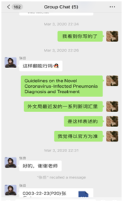 2月27日,谢瑜带着前期选拔的四位英语系本科生,开始承担无锡市外办委托的《新型冠状病毒感染的肺炎公众防护指南》的翻译任务,由于书中涉及大量医学专业术语和表格插图,再加上时间较紧,导致了此次翻译工作的难度和强度前所未有。翻译团队为确保译文的准确性,进行了大量的资料搜集、平行文本阅读、查证审核等工作,谢老师和同学们的线上讨论时常延续到深夜,直至3月11日,这本书的翻译工作才告一段落,恰逢国内形势好转、国外疫情开始爆发之时,这本英文版的《防护指南》将作为无锡市外办的一份厚礼赠送给在锡和正在返锡的国际友人。