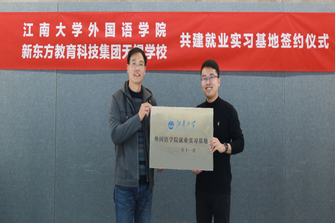 11月25日下午,江南大学外国语学院与新东方无锡学校合作共建就业实习基地签约授牌仪式在无锡新东方恒隆总部举行。外国语学院党委书记史志洪、党委副书记刘伯贤、辅导员苗文建与新东方无锡学校校长杨涛、人力资源部总监吕娜、人力资源部总监助理唐杰等共同出席了此次会议。
