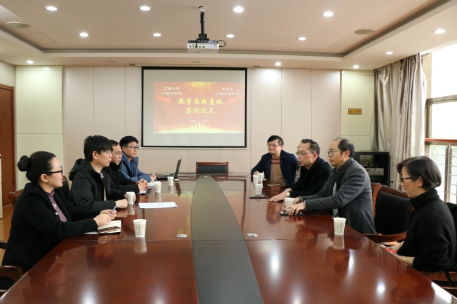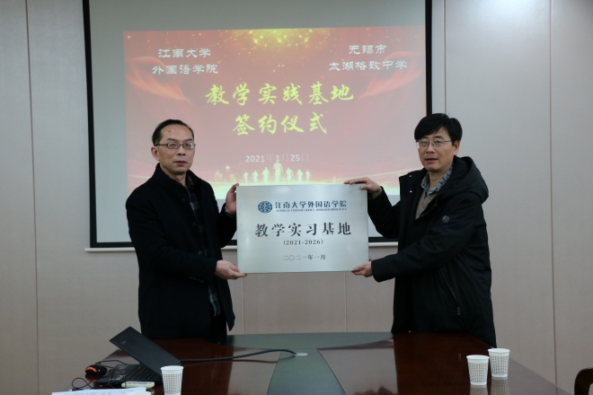 2021年1月25日下午,外国语学院与无锡市太湖格致中学共建教学实习基地暨授牌仪式在无锡市太湖格致中学三楼会议室举行。外国语学院院长方文开、党委副书记刘伯贤、副院长顾琦一、副院长谢竞贤及学院社会服务部程方老师、无锡市太湖格致中学校长惠晓虹、副校长蒋茂元、副校长余志明、副校长王万萌参加了签约仪式。