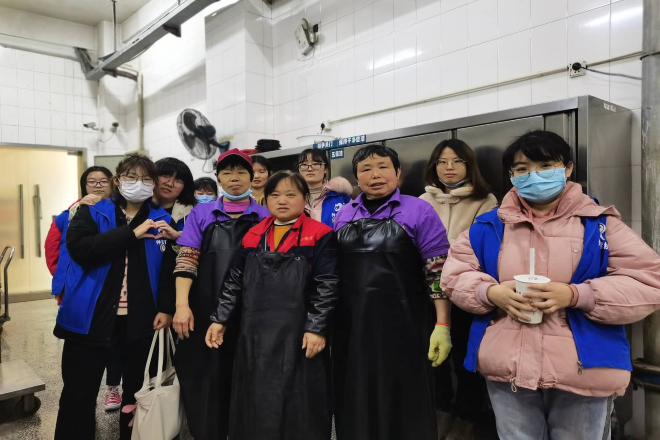 本次活动在三食堂和四食堂开展。进入食堂后,食堂负责人为大家分发了手套、围裙等工具,随后大家开始协助食堂阿姨进行工作。每个人各司其职,尽力为食堂女职工分担工作,让她们在属于自己的节日里感受到关怀和爱护。午饭过后,食堂里前来就餐的学生渐渐少了,本次活动也接近尾声,最后外院学子与阿姨们合影留念道别。