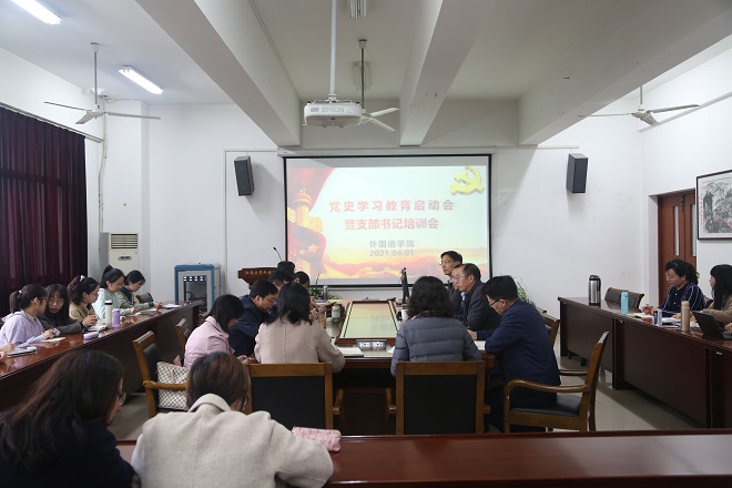 2021年是中国共产党建党100周年,也是“十四五”规划的开局之年,站在“两个一百年”奋斗目标历史交汇的关键节点,在全党集中开展党史学习教育,重温党的光辉历程,具有重大的意义。4月1日,外国语学院召开了党史学习教育启动会暨党支部书记培训会,对学院的党史学习教育工作进行了动员部署,并对基层党建工作进行专题培训。校党委组织部副部长耿向阳、学院党委委员、教工及学生党支部全体支部委员参加会议,学院党委副书记刘伯贤主持会议。