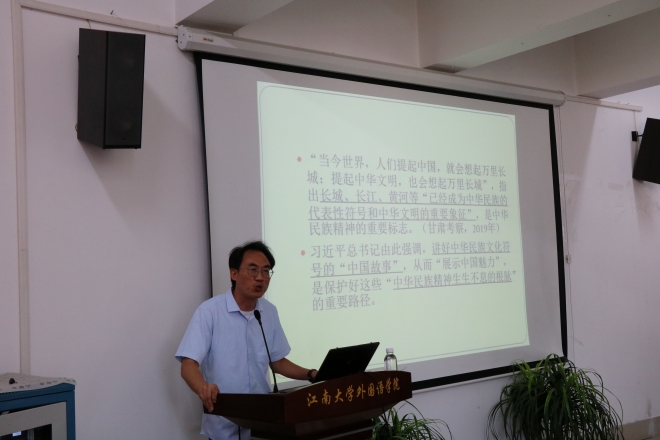 陈伟首先从传播学跨学科的角度,基于以习近平同志为核心的党中央提出的高度重视文化建设的指示,介绍了中华文化符号的传播意义和价值,明确了外语人应该具备何种敏感性树立、何种全球观,通过文化符号,传播优秀文明。接着,陈伟由浅入深,层层递进,分别从文化符号的本质、意义结构和传播属性,文化符号传播的历史价值、空间价值和现代化转化以及中华文化符号传播的叙事和表现形式等方面,阐述了利用中华文化符号,讲好“中国故事”的重要性,同时也再次强调了外语人的责任与使命,要通过构建基于内容创作的“中国故事、世界表达”,主动发声,深度诠释中华文化符号蕴含的民族精神、品质与价值观念。