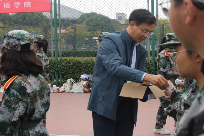 11月2日上午,外国语学院党委书记史志洪、党委副书记刘伯贤、分团委书记陆芳、辅导员顾海星来到军训场地,了解大一新生军训情况,亲切慰问并现场检阅了同学们的训练成果。