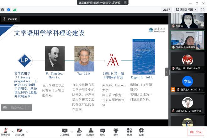 外国语学院“Sharing Space分享空间”是外国语学院在新文科、新外语背景下,旨在为广大外院学子搭建学术、技能等信息分享交流平台。3月26日,“Sharing Space分享空间”邀请外国语学院张俊萍副教授线上参与主讲“文学与语言学的交点”主题圆桌会,会议吸引近百名同学参与线上交流。