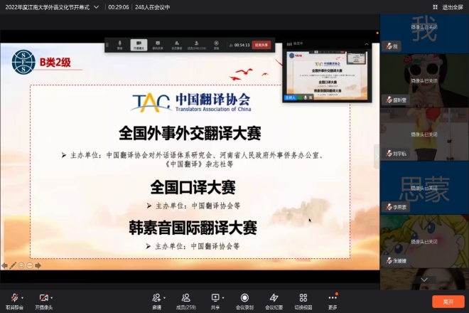 主持人宣读了2021年获得各项荣誉学生和集体名单,并对学院抗疫志愿者进行表彰。陆芳发布2022年外语学科竞赛,并鼓励同学们踊跃参赛,在竞赛中提升专业能力。外国语学院学生会尹雨泽同学对2021-2022学年学生会主办的外语类活动进行了线上介绍。