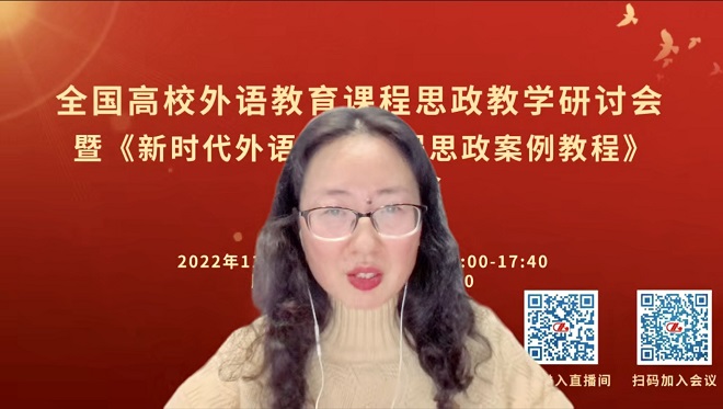 11月20日全国高校外语教育课程思政教学研讨会在线召开。本次会议由西南大学外国语学院和中国人民大学出版社主办,来自全国各地共2000多位高校外语教师参加。会议共有4个主题报告,8个案例分享。外国语学院大学英语教师王伟炜应邀做大会发言,分享了《大学英语视听说》课程思政教学设计样例。这是本次会议上唯一一个入选分享的大学英语课程思政教学案例,受到了与会专家与教师的广泛好评。本次分享也是我校大学英语课程思政建设工作第二次在全国外语界公开展示,发挥了良好的示范与辐射效应。