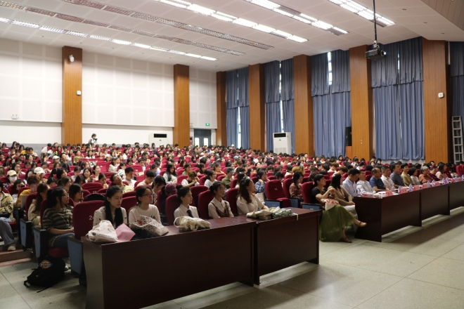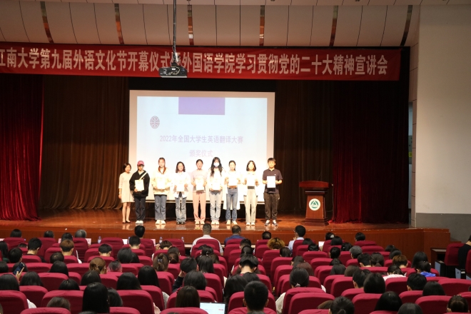 4月19日下午,江南大学第九届外语文化节开幕式暨外国语学院学习贯彻党的二十大精神宣讲会在南区大学生活动中心如期举行。外国语学院党委书记李荣华、校党委学生工作部副部长俞立峰、校团委副书记杨飏、学院党委副书记刘伯贤、“振初琴华奖学金”捐赠代表陈志钢、学院关工委常务副主任鲍国庆、关工委委员吴艳敏、学院分团委书记陆芳等老师出席本次活动,相关学院学生代表以及学院500余名学生参会。