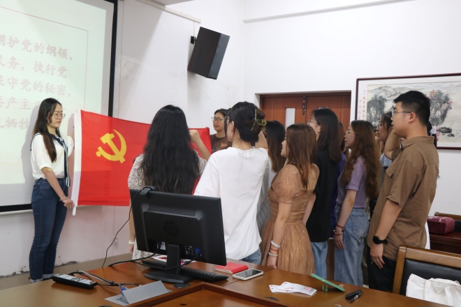时值“七一”来临之际,为教育党员始终保持党的先进性,激发新党员的责任感和使命感,不忘初心,外国语学院在6月19日于外院楼A349举行新党员“七一”入党宣誓仪式。外国语学院党委副书记刘伯贤、关工委常务副主任鲍国庆、委员吴艳敏、分团委书记陆芳出席宣誓仪式。本次活动共20名新发展党员参加,分团委书记陆芳主持会议。