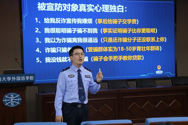 首先,由无锡市公安局滨湖分局雪浪派出所的杨恺警官进行新生防诈反诈安全教育。杨恺从电信诈骗、游戏诈骗、刷单诈骗、情感诈骗等四个方面,详细解读了各类诈骗行为,深入剖析宣防对象的心理独白,并通过生动形象的案例、有趣的互动问答,警示新生提高反诈意识,保护自己的财产安全,谨防诈骗。