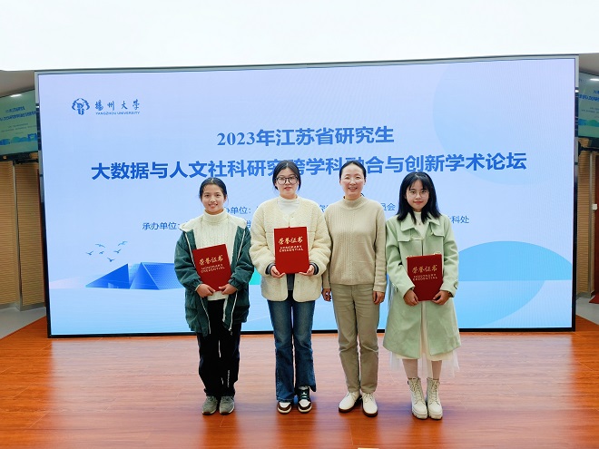 12月9日,江苏省研究生大数据与人文社科研究跨学科融合与创新学术论坛在扬州大学召开。本届论坛由江苏省文学类研究生教育指导委员会主办,扬州大学承办。来自省内10余所高校的49名硕博研究生与带队教师共同出席了本次学术论坛。外国语学院2022级研究生王婷以及2023级研究生方漩和胡婷婷在副院长谢竞贤的带领下参加了本次论坛。