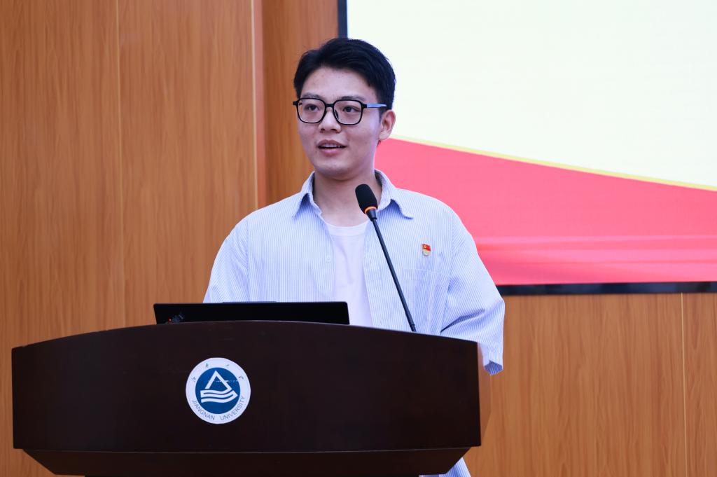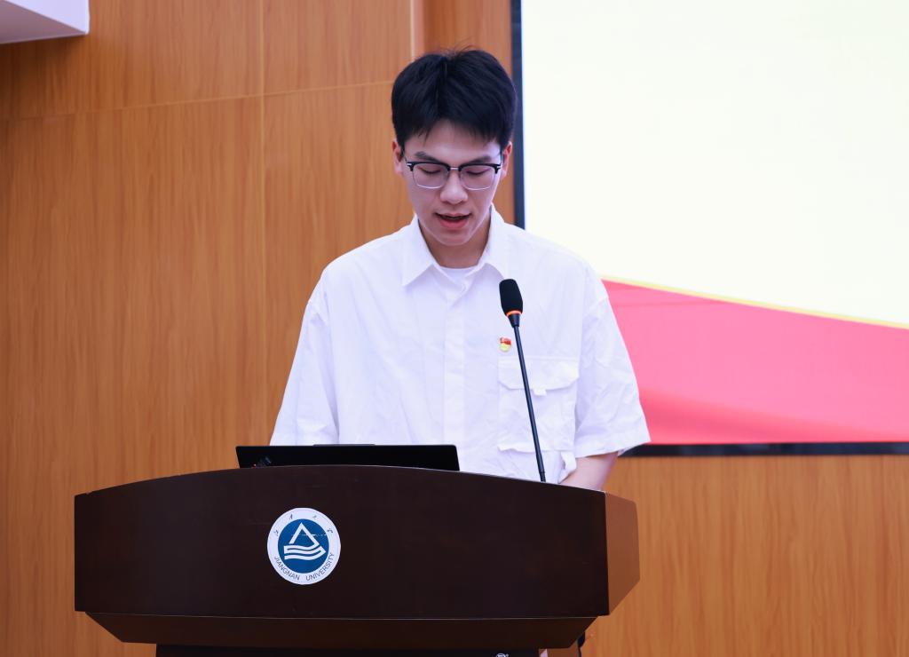 控制科学与工程2024级硕士研究生张旭航和2022级本科生张景然分别作为老党员和新党员代表发言。张旭航结合自己2021年入党时的初心和奔赴新疆支教的经历,分享了将个人理想融入国家需要的深刻感悟。他勉励新党员同志们要以理想信念铸魂,做对党忠诚的排头兵;以求真务实立身,做担当作为的实干家;以奉献报国励志,做心怀天下的奋斗者,用实际行动书写无愧于时代的青春篇章。张景然代表全体新党员郑重承诺,将坚定理想信念,强化理论武装;勇敢承担使命,发挥模范作用;提升本领能力,贡献青春力量,以实际行动践行入党誓词,努力成为一名合格的共产党员。