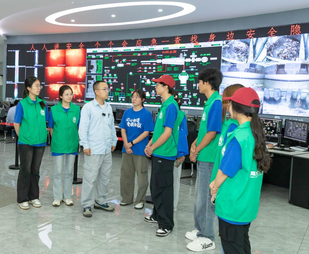 研学赋能:探秘环保科技,筑牢知识根基。实践团首站走进无锡锡东环保能源有限公司——国内首个“原址复活”的垃圾焚烧发电项目、国家“AAA级生活垃圾焚烧厂”及全国首批青少年生态文明教育实践场馆(2025年入选)。在公司展厅,成员们通过数字多媒体、电子沙盘、仿真模型等多元形式,深入了解垃圾处理全生命周期。透过厂区透明玻璃幕墙,大家直观见证了垃圾仓抓斗作业与负压防臭工艺;在中控室实时监测屏前,系统学习了“变废为电”的绿色能量转换全过程。“亲眼目睹庞大的垃圾山转化为绿色电能,震撼深刻。”实践团队长刘雯丽表示,“这刷新了认知,更让我们理解了前端垃圾分类对后端资源化利用的极端重要性。这些知识是我们后续行动最坚实的支撑。”