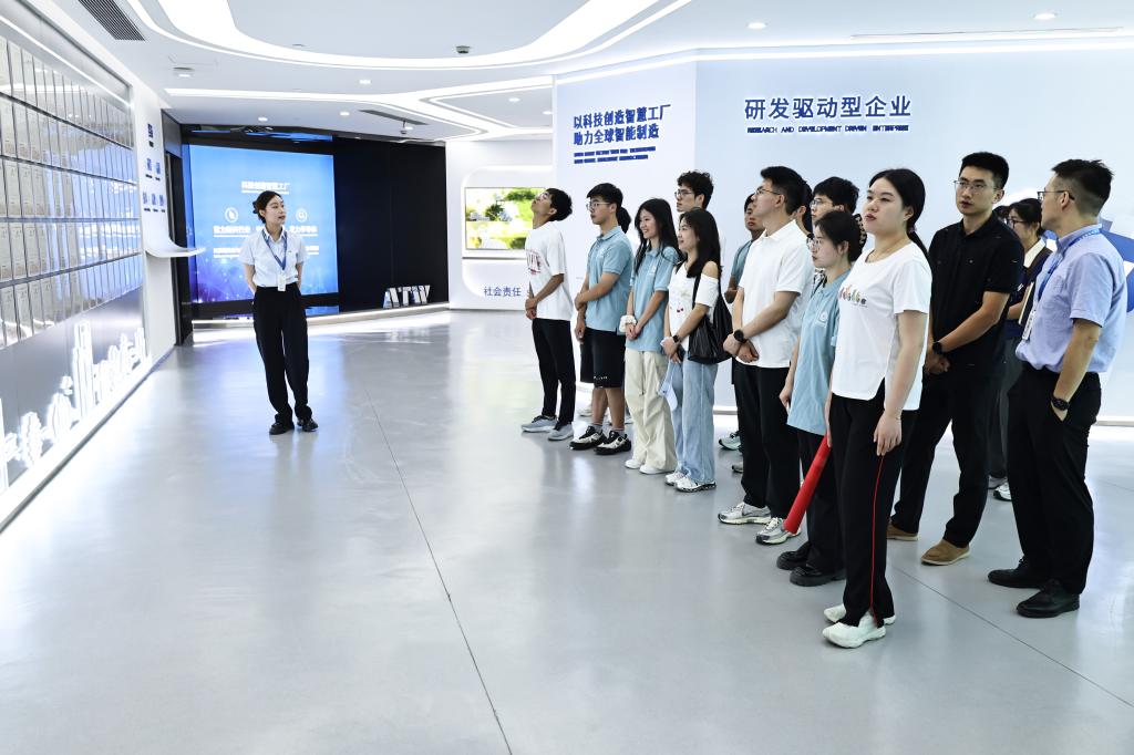 参观研学,感知智造新动脉。实践团师生深入各企业展厅、生产车间等一线场所,实地了解企业发展历程与前沿动态。在朗新科技产业园,动态数据墙清晰展示了其“能源数字化+能源互联网”双轮驱动战略的转型脉络。在卓品智能,师生们感受了企业自主创新、突破技术封锁的历程。在小天鹅电器,团队师生了解了企业的发展历程和产品品类,体会企业如何用“科技+品牌”策略精准触达多元需求。在先导智能,讲解员介绍了四大核心业务领域的战略布局与发展历程,制造车间内自动化设备的精准运作令人印象深刻。奥特维运行车间内高效的激光切割与双模具焊接场景,以及威孚集团“四次创业”的发展历程与智慧工厂管控平台的实时数据流,生动展现了从“传统制造”迈向“数字制造”的升级图景,让同学们身临其境地触摸到产业前沿的发展脉动。