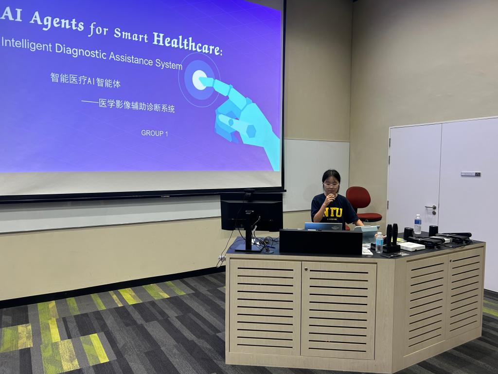 在结业汇报环节,同学们与来自国内多所高校的学生混合编组,围绕“AI Agents for Smart X”这一主题,进行为期多天的合作研讨与展示准备。各小组在最终汇报中呈现出多样化的AI应用设计方案:有的聚焦智能医疗,提出医学影像辅助诊断系统;有的探索音乐领域,开发智能音乐助手;还有小组尝试将AI应用于远程控制与医疗保健场景。每组在15分钟的展示与问答中,不仅清晰阐述方案构思,也展现出对人工智能技术的深入理解与创新应用能力。评委老师对各组展示给予高度评价,并从技术可行性、社会价值等维度提出专业建议。最终,由电气2301班宋雨璇和物联网2303班邹安平所在小组因出色表现荣获“优胜奖”,为游学课程画上圆满句号。