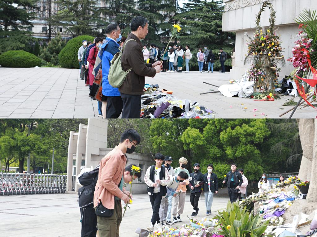 退休教师及学生们向烈士纪念碑献花
