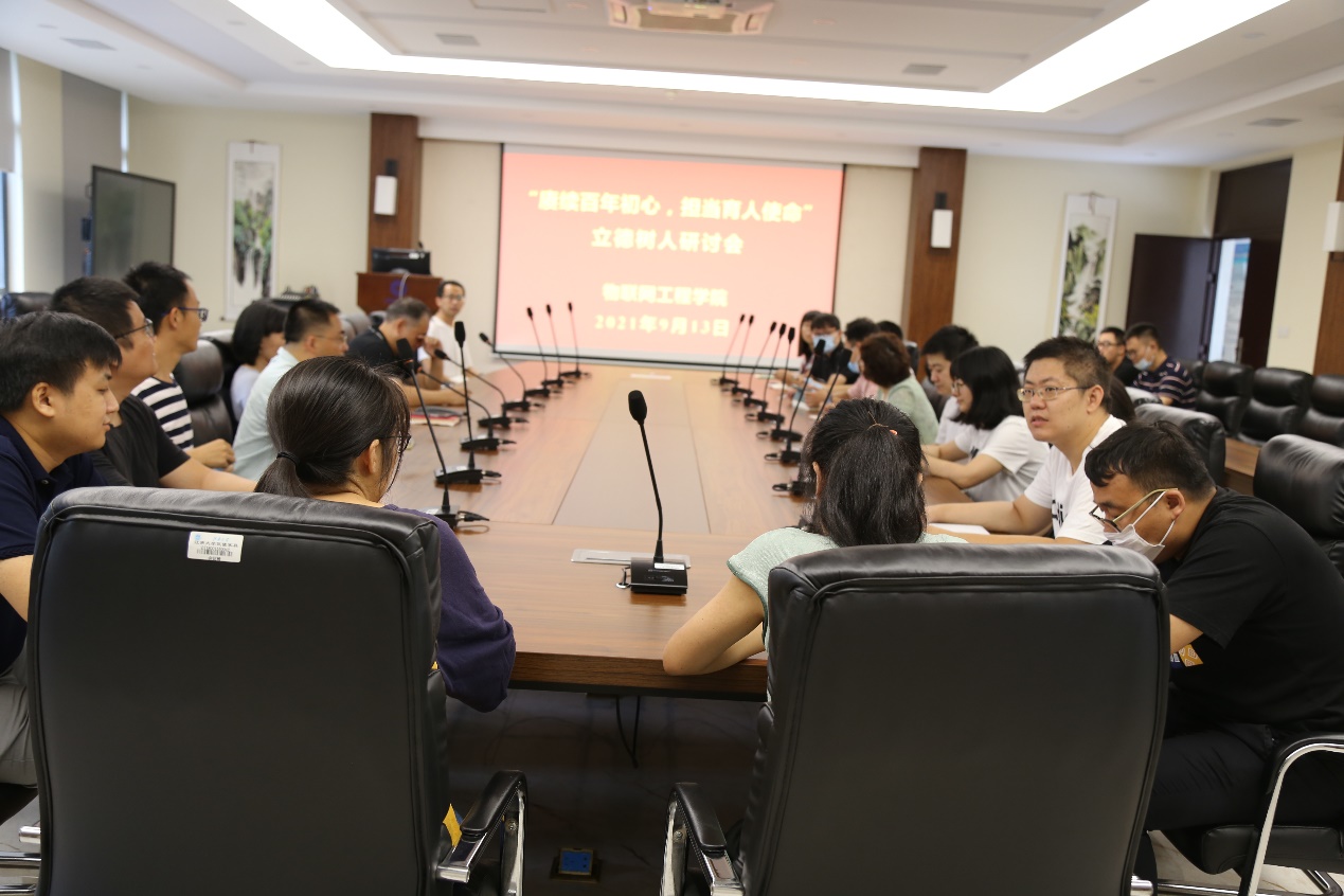为庆祝第37个教师节,同时进一步弘扬师德师风,提升青年教师业务技能,9月13日上午,物联网工程学院在B222会议室,举行了以“赓续百年初心,担当育人使命”为主题的立德树人研讨会。学院党委书记程捷音、院长谢林柏出席会议,各系主任及青年教师代表20余人参加了活动。会议由副院长陶洪峰主持。