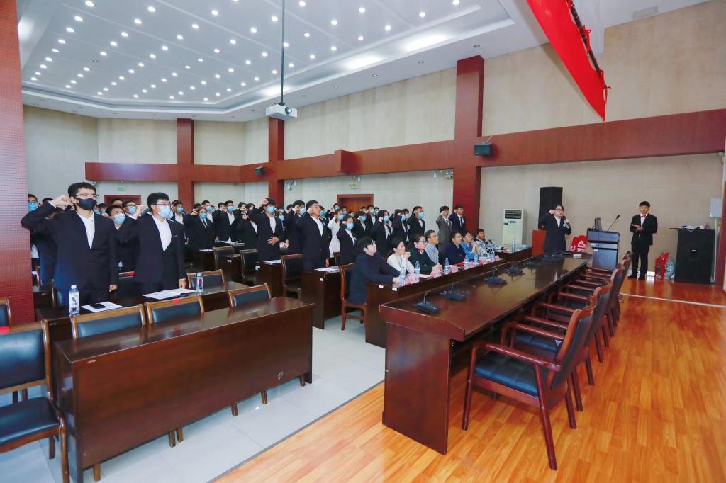随后,陈小龙、孔丽丹与参会嘉宾一起为营员代表佩戴营徽,全体营员庄严宣读训练营誓词。