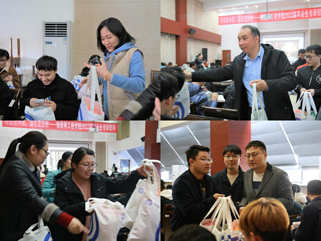 为帮助考研学子在紧张备考的同时缓解压力,将“我为师生办实事”落细落地,11月24日下午,物联网工程学院2022届考研慰问活动在学院D328举行。学院党委书记程捷音、院长谢林柏、党委副书记孔丽丹,毕业班辅导员、班主任代表,及130余名考研学子共同参加活动。活动由孔丽丹主持。