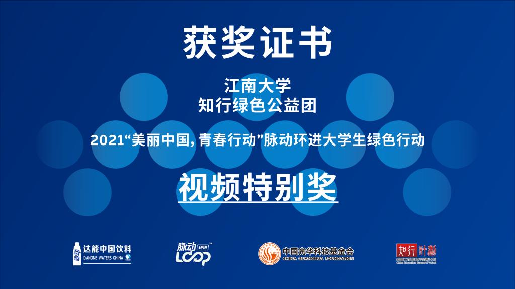 近日,江南大学“知行绿色”大学生公益团在2021年“美丽中国,青春行动”脉动环进大学生绿色行动中获全国金奖(全国唯一)、视频特别奖。公益团主要成员由物联网工程学院学生会、青年志愿者协会组成,来自清华大学、复旦大学等全国15所高校的团队入围决赛。