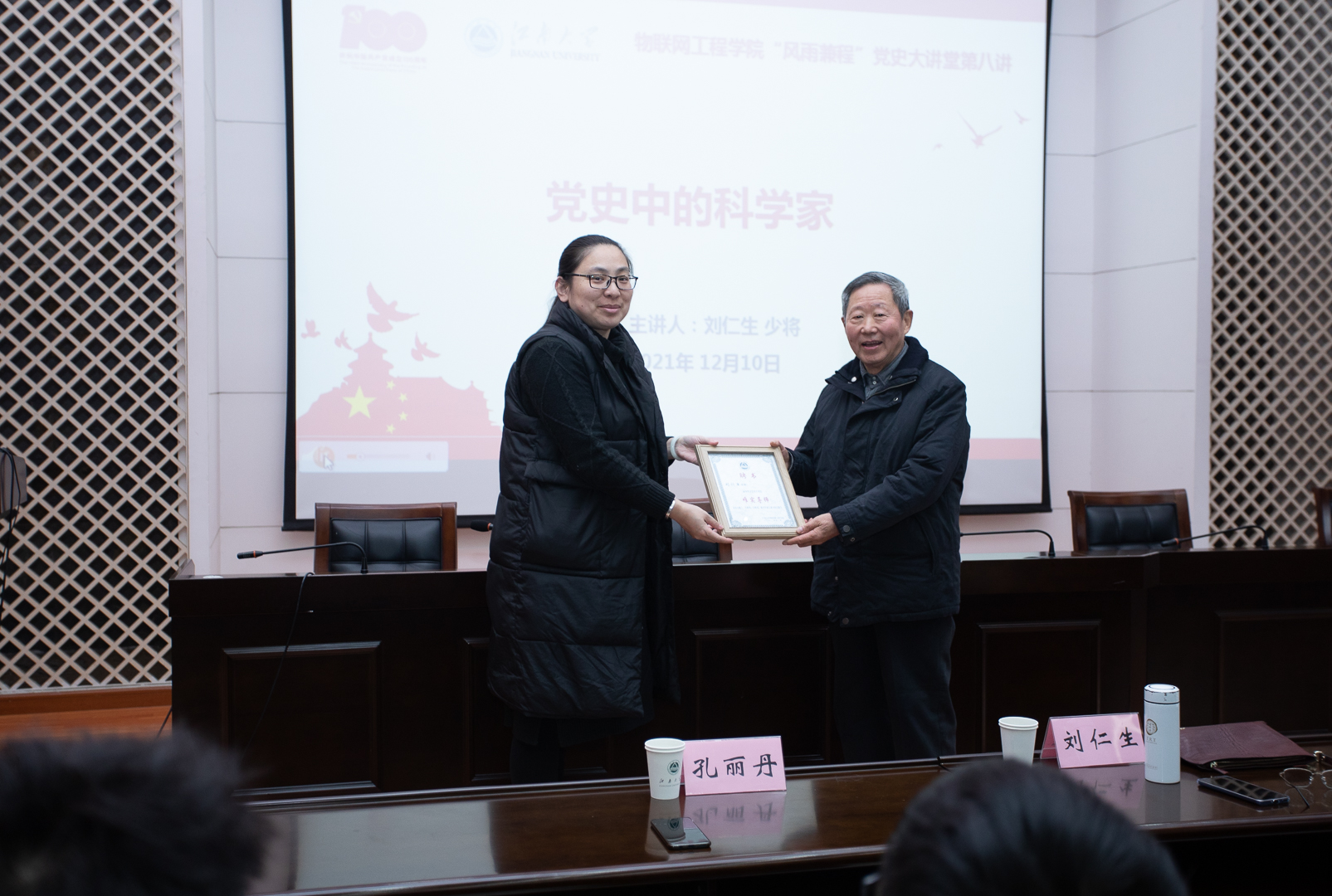 党课前,孔丽丹代表学院向刘仁生少将颁发“唯实导师”聘书,聘请刘仁生少将做青年人成长成才的引路人。