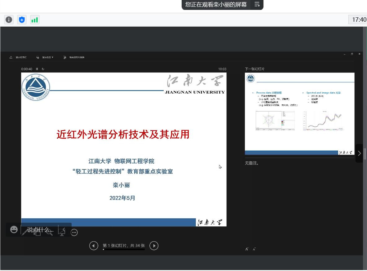 栾小丽以《近红外光谱分析技术及其应用》为题进行分享。她运用生动鲜活的例子深入浅出地讲解了近红外光谱仪的工作原理、常用的建模方法以及近红外光谱分析技术在生物、食品、化工等方面的应用,并就其团队近年来在近红外光谱分析技术中的典型应用进行介绍,对其发展趋势进行了展望。