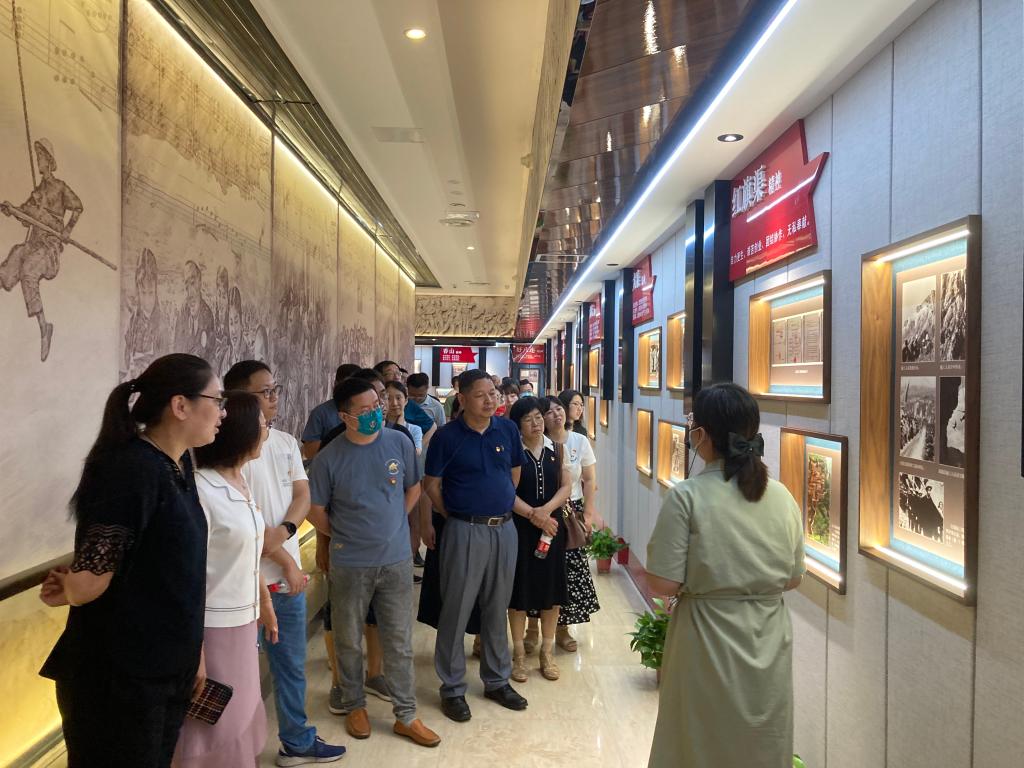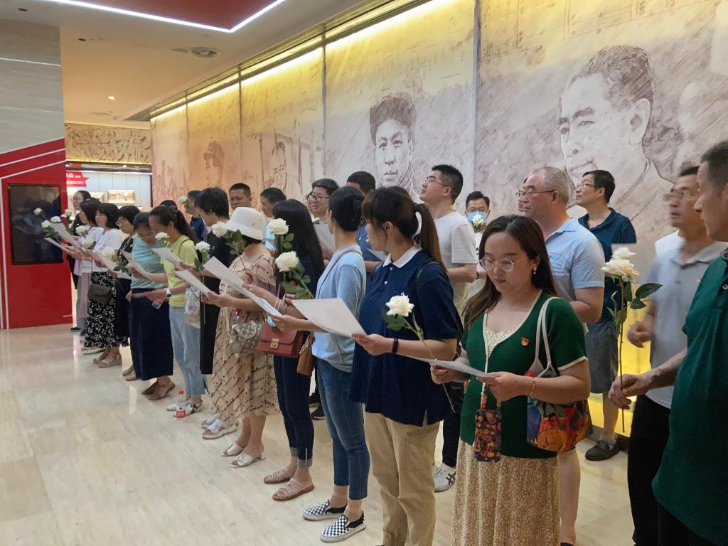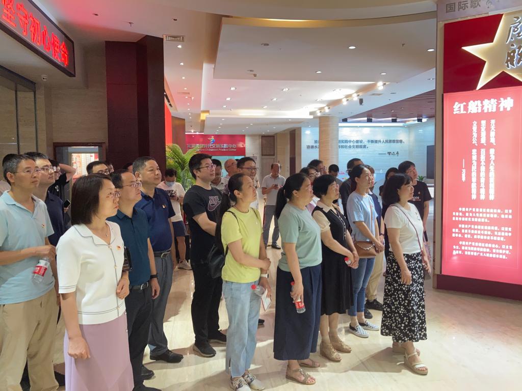 在无锡滨湖党建馆,党员们面对党旗庄严宣誓,重温入党誓词。在中国共产党红色精神谱主题展示区,大家参观了起航、星火、圣地、烽烟、黎明、奋斗、复兴、丰碑等8个专题展厅,在讲解员的带领下,学习了红船精神、井冈山精神、延安精神、西柏坡精神、红旗渠精神、载人航天精神、抗疫精神等35种中国共产党在不同时期形成的伟大红色精神。