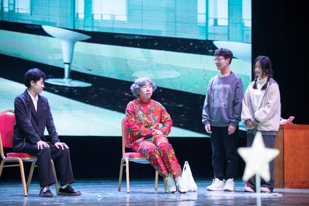 第三篇章,梦的光点,砥砺奋进新时代。由艺术团主持礼仪部表演的《花之舞》走秀震撼全场,精致的妆容与优美的走姿相得益彰,于浪漫优雅中呈现张驰有度的动感;艺术团话剧部带来的话剧《反诈银行》以接地气的造型,网络上熟悉的梗,再现了当下诈骗分子五花八门的行骗手段,让大家在欢声笑语中掌握了反诈知识,提高了识骗防骗能力,引得观众阵阵笑声;艺术团声乐部的歌曲《飞云之下》让人身临其境,鼓励着同学们勇于挑战,不负韶华;辅导员和班助们的舞蹈《开心超人》活力四射,大家纷纷拿出手机拍照录像,在班群里分享着这欢乐一刻。