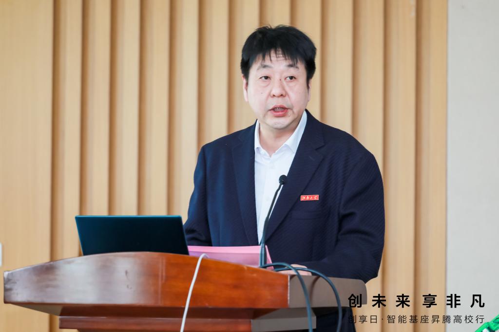 倪松涛代表学校致辞。他介绍了“智能基座”产教融合协同育人项目的背景和合作内容,肯定了江南大学-华为“智能基座”协同育人基地项目在过去的两年内取得的多项成果,并表示学校将持续深化产教融合协同育人,创新优化人才生态链,进一步推动双方在人才培养、课程建设、创新实践等方面更深层次、更广领域、更高水平的合作。