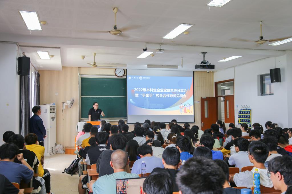 开幕仪式结束后,各位企业家班主任前往班级教室召开了首次分享会。他们分享个人成长与工作经历、展示企业文化、讲述行业发展前景,为各位同学开阔眼界,答疑解惑。“手牵手”校企合作导师和学生进行了深入交流,并进行了互动游戏。各位同学热情高涨、参与热烈。
