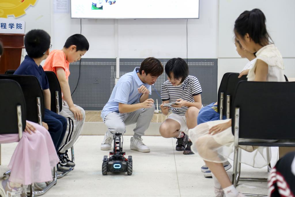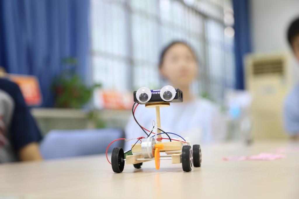 为了让小朋友们更真实地体验芯片的科技之美,现场设置了“声控智能小车”的动手实践环节,在志愿者的指导下亲身探索芯片奥秘。组装车架、对接电线、黏贴芯片模组、固定齿轮、安装电池,小朋友五人一组,如火如荼地动手“施工”。伴随着此起彼伏雷鸣般的掌声,智能车应声而动、徐徐前进,车顶的芯片骄傲的向众人展示它的神奇科技“魔法”。接着,由物联网工程学院智能车俱乐部自主研发的作品——“无线智能机械臂小车”压轴登场,原地360度转弯、横向纵向平移、机械臂抓取矿泉水瓶,一套套“高阶”操作不断刷新小朋友们对芯片的认知,过了一把“含金量”十足的芯片“瘾”。