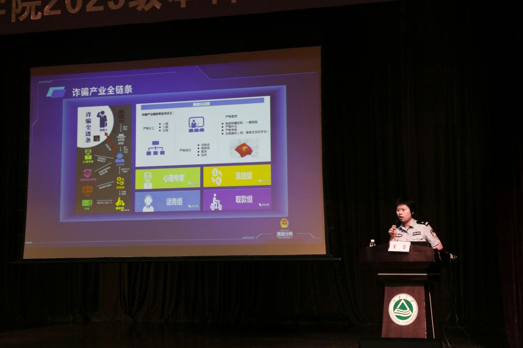 反诈宣传版块,学院特邀雪浪派出所警官现身说法。董蕾警官以“防范电信网络诈骗”为题,从介绍电信网络诈骗的定义、电信网络诈骗的基本特征入手,分享学生电信网络诈骗的典型案例,以学生受骗常见方式教育引导学生规范网络行为,正确识别诈骗手段,提醒学生在互联网的虚拟世界里,要做到个人信息不透露、未知链接不点击、陌生来电不轻信、转账汇款多核实等。